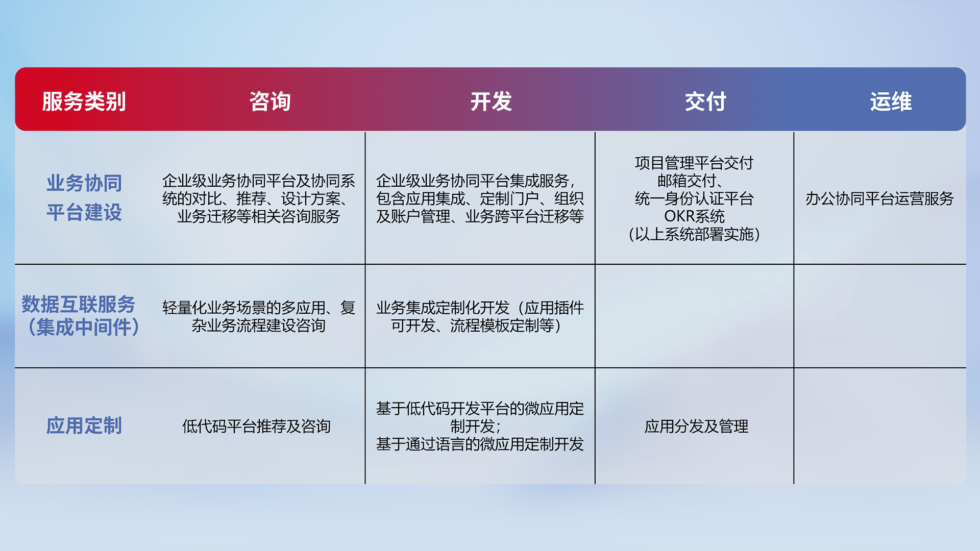 针对钉钉、、、、企微、、IDaas等平台级产品提供产品的规划、、方案、、、交付、、定制化开发等服务,,,,实现如统一协同办公、、、、智能客户服务、、、混合会议管理、、、智能数据查询、、、等业务场景,,,实现数字化转型。。
