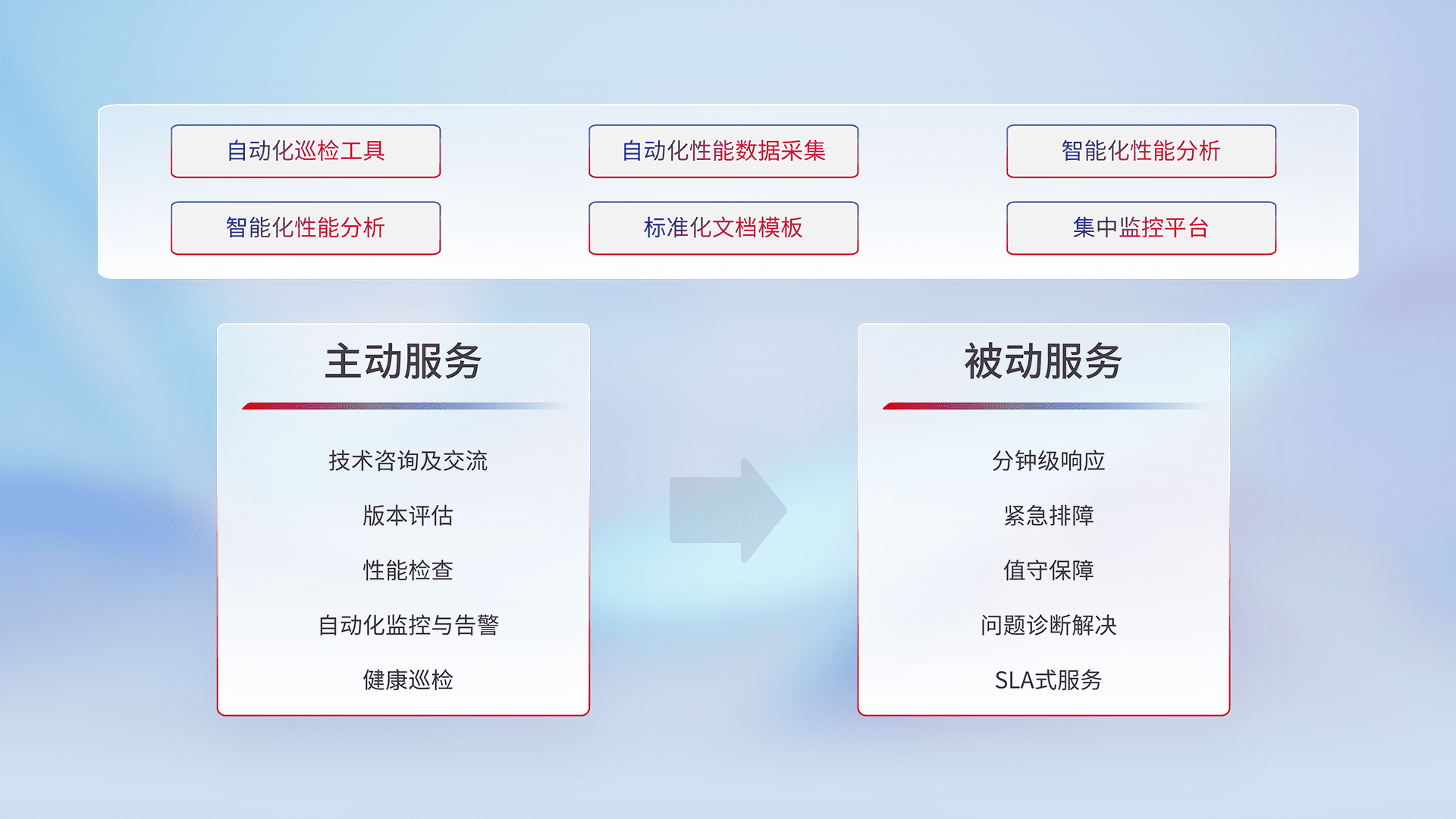 智能化工具和标准化文档,,,保障服务质量,,,提供主动服务(包含技术咨询、、版本评估、、、性能检查、、、、自动化监控与告警、、、健康巡检)和被动服务包含(分钟级响应、、、、紧急排障、、值守保障、、、问题诊断解决、、、、SLA服务)。。