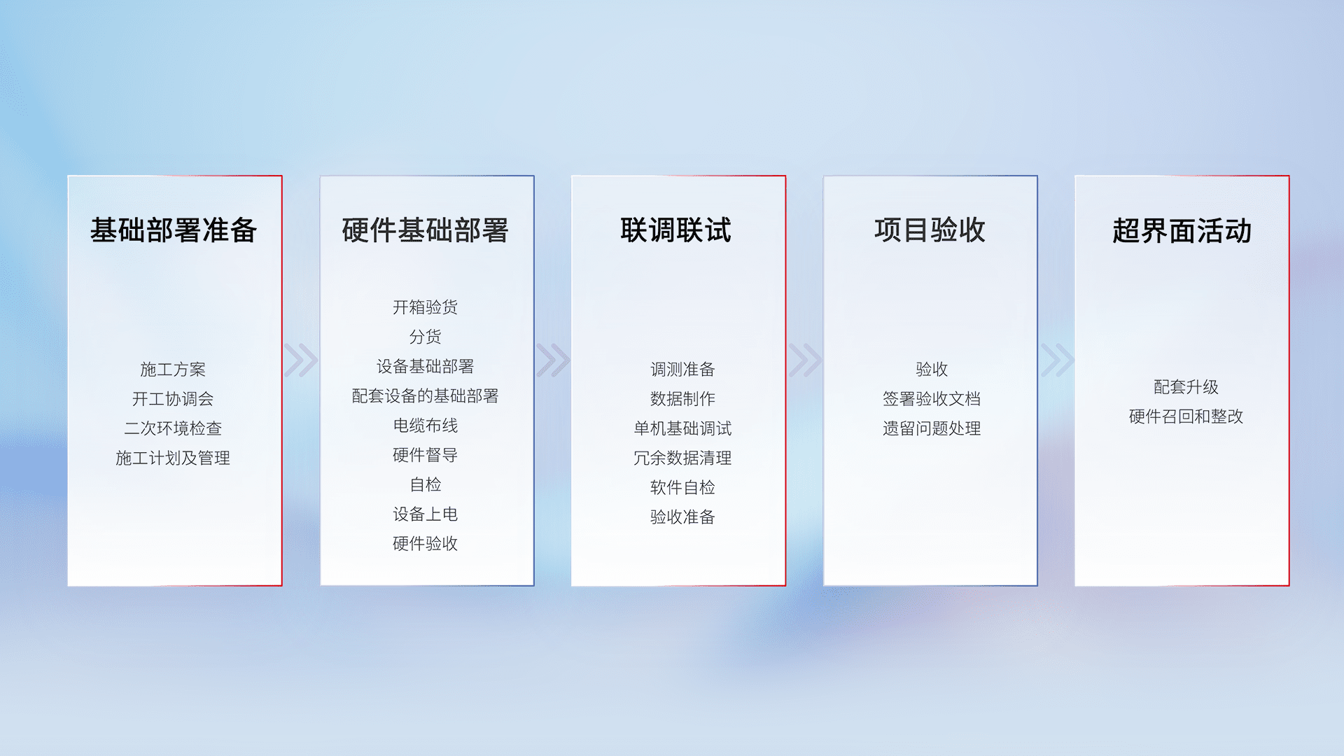 从基础部署准备、、硬件基础部署、、联调联试、、、项目验收、、越界面活动的全过程可追溯,,,保证施工质量和进度。。